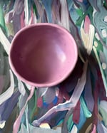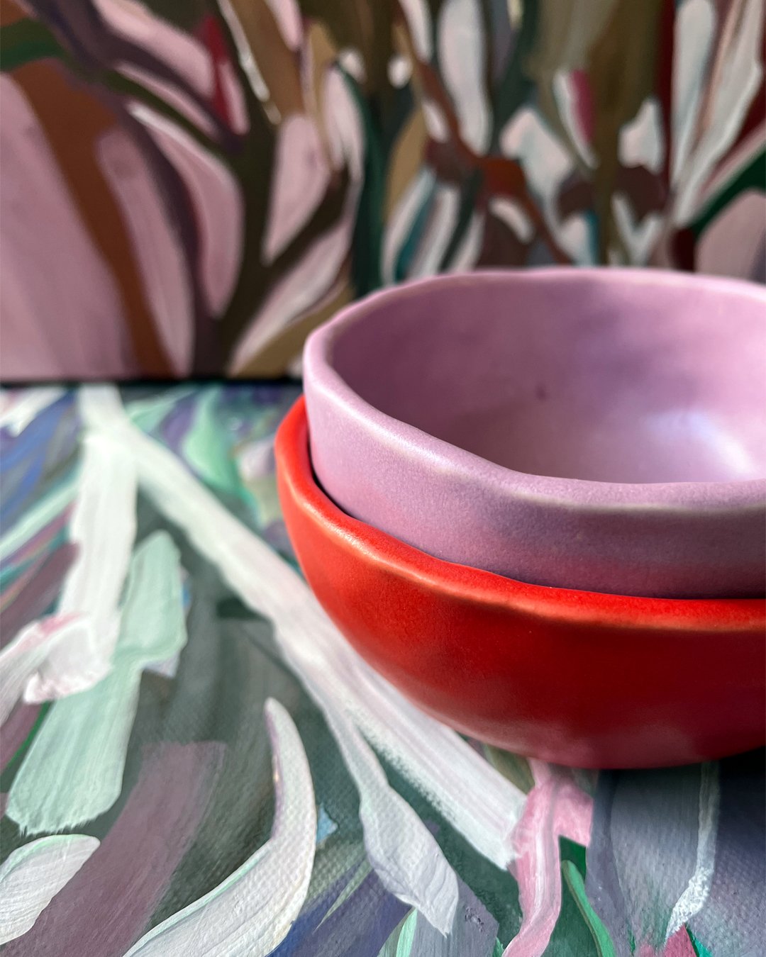 Set of two stackable bowls, hand-formed in white stoneware. Bowl #1 is glazed in red, while bowl #2 is glazed in lilac.