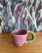 Squigglevision for your coffee. Hand-formed in white stoneware. Dipped in lilac and pale green glazes.